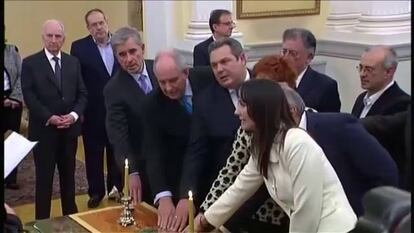 Por primera vez en la historia del país ha habido dos ceremonias, primero una religiosa y a continuación otra civil. Entre los nueve altos cargos que han optado por jurar sobre el Evangelio estaba, como se preveía, el líder de ANEL, el derechista Panos Kamenos, ministro de Defensa, pero también un hombre muy próximo a Tsipras, Panayotis Kurublís (titular de Salud), que llegó a Syriza desde el Pasok en 2011. Inmediatamente después ha prometido el resto del Gabinete, la mayor parte de los hombres sin corbata, estilo Tsipras.