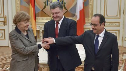 Ante la mortífera escalada bélica en el este de Ucrania, la diplomacia occidental se ha movilizado con una misión de paz destinada a asegurar que se cumplen los 12 puntos de los acuerdos alcanzados el pasado septiembre en Minsk entre Ucrania, Rusia y los separatistas prorrusos bajo la égida de la OSCE. El presidente François Hollande y la canciller Angela Merkel, viajaron el jueves a Kiev, donde se entrevistaron durante más de tres horas con el presidente ucranio Petró Poroshenko. De Kiev, ambos se desplazarán este viernes a Moscú para entrevistarse con el presidente ruso, Vladímir Putin. Tras su cita con el líder ucranio, no comparecieron ante los medios de comunicación, en contra de lo que habían planeado los responsables de prensa de la presidencia ucrania.