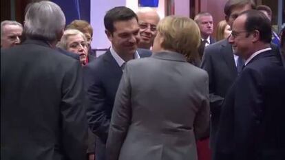Con traje oscuro y sin corbata, dentro de la sala Tsipras ha ido saludando a los jefes de Estado y Gobierno, sobre todo a los que conoce por las reuniones que mantuvo durante su gira europea de la semana pasada: el francés François Hollande y el italiano Matteo Renzi. La canciller alemana, Angela Merkel, ha dado el primer paso en acercarse a estrecharle la mano.