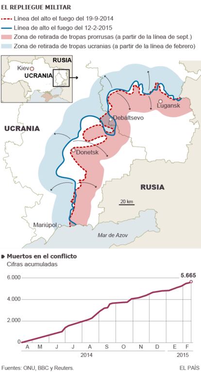 Ucrania sufrió este martes un duro revés en su batalla contra los separatistas del este respaldados por Rusia. Apenas una semana después de haber firmado en Minsk (Bielorrusia) el segundo intento de paz en la región, la derrota del Ejército de Kiev en Debáltsevo, un punto estratégico que conecta las dos zonas rebeldes, Donetsk y Lugansk, sitúa el conflicto en una nueva fase. La humillación de los soldados ucranios —más de 2.000 abandonaron la ciudad asediada desde hacía días por los separatistas, según reconoció el propio presidente ucranio, Petró Poroshenko— movilizó a la Unión Europea, Estados Unidos y la OTAN, que no dudaron en considerar la caída de Debáltsevo como una violación del alto el fuego pactado.