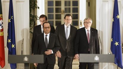 La polémica entre los Gobiernos de Grecia, España y Portugal se ha convertido este miércoles en la gran protagonista de la cumbre energética que celebraron en Madrid Mariano Rajoy, François Hollande, Pedro Passos Coelho y Jean-Claude Juncker. Todos ellos han tratado de rebajar la tensión creada, aunque el más claro fue el presidente de la Comisión Europea: “No he observado que España y Portugal tengan un plan diabólico para derrotar a [Alexis] Tsipras”, el primer ministro griego, ha dicho Juncker en tono irónico. “Si hubiera observado que Mariano y Pedro estuvieran haciendo algo similar, habría actuado, pero no ha sido así”, ha añadido.