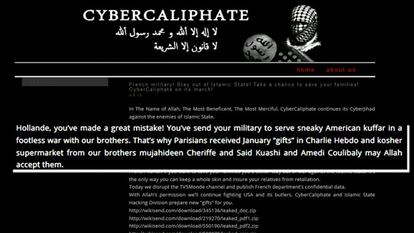 El Gobierno francés se ha mostrado particularmente preocupado por este ciberataque. En las pantallas de televisión, la programación habitual de las 11 cadenas que explota el grupo público quedó sustituida por la fotografía de una bandera negra que exhibía un lema: “Yo soy ISIS”. Es un juego dialéctico que toma por modelo el lema antiterrorista “Yo soy Charlie”, por el ataque yihadista a la revista satírica Charlie Hebdo de enero. ISIS son las iniciales en inglés del Estado Islámico. Firmaba el ataque el grupo yihadista CyberCalifato. "Esto demuestra que nos enfrentamos a gente muy determinada", ha declarado el ministro del Interior Bernard Cazeneuve. "Nosotros estamos determinados a combatirlos y a adaptarnos de manera permanente a los nuevos sistemas".