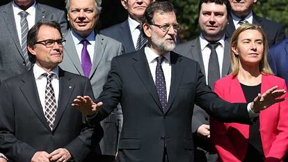 Luego se dirigieron todos a participar en la habitual foto de familia de estos encuentros, en los jardines del palacio real de Pedralbes, justo antes de que se inaugurara el encuentro. La inauguración siguió una estudiada coreografía política para acomodar todas las sensibilidades y evitar un innecesario choque entre el Gobierno central y el catalán. Mas, que hace tan solo unos días no se sabía si tendría algún papel, intervino en primer lugar pero Rajoy tuvo la última palabra, dejando entre ambos a Mogherini y Rinkevics.