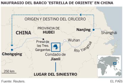 En total viajaban en el barco 405 turistas, 47 miembros de la tripulación y cinco trabajadores de una agencia de viajes. El barco hundido cubría la ruta de Nanjing, capital de la provincia oriental de Jiangsu, hasta Chongqing, una de las mayores ciudades de China, en el suroeste del país. La nave, con capacidad máxima de 534 pasajeros, era propiedad de una empresa de Chongqing especializada en cruceros que atraviesan el popular destino turístico de Las Tres Gargantas.