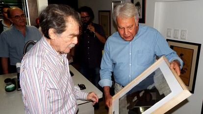 Han pasado casi cuatro horas de charla, cuando a Mendoza le avisan de que González está de camino. Petkoff se revuelve, se levanta y se empieza a mover intranquilo por la casa. Sale a la entrada del domicilio, donde unos obreros terminan de colocar unas bombillas. “Venga, dense prisa”, les espeta, mientras regresa al interior de la casa. Cuando González entra, se cuadra y bromea con un saludo militar: “¡A sus órdenes!”. Los dos se abrazan emocionados. Ni una palabra. Cuando el expresidente le da el premio Ortega y Gasset, Teodoro no le quita ojo. “¿Chillida, no?”, pregunta sobre el autor del cuadro mientras tira de él. “¡Bueno, aflójalo!”, le suelta a González, para después llevarlo donde ha decidido colgar el premio. El expresidente se gira y, antes de quedarse a solas con su viejo amigo, comenta sobre su reencuentro: “Esto sí es una buena noticia”.
