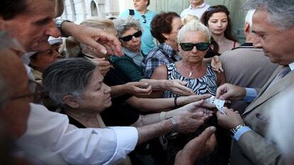 “Son trágicas”, dice con un hilillo de voz la señora Vangelia cuando se le pregunta por las nuevas medidas de austeridad que deberá aprobar el Gobierno heleno antes del miércoles para que sus socios acepten otorgar el tercer rescate a Grecia. A sus 72 años, mientras arrastra las piernas con dificultad en la calurosa mañana, teme que su pensión se vea “aún más recortada”. El 60% de las pensiones en Grecia son inferiores a los 700 euros, después de varias rondas de reducciones, y a partir del año que viene, el Ejecutivo deberá rebajar el coste de su sistema de jubilación en el equivalente al 1% del PIB. Pero la anciana, que porta sobre el cuello el águila bicéfala emblema de la muy conservadora Iglesia Ortodoxa de Grecia, no guarda rencor a Tsipras: “Es un buen mozo, el gobernante más joven que hemos tenido. La culpa es de los alemanes, sobre todo del ministro ese de Finanzas, como se llame…”.