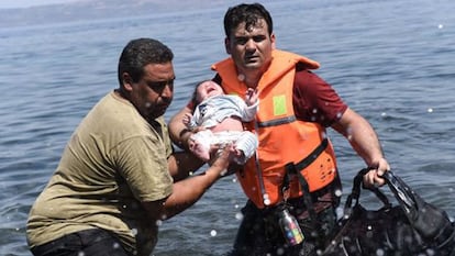 "¡Libertad!", gritan en árabe desde la zódiac un grupo de jóvenes pletóricos. Impacientes. Algunos se lanzan al agua para recorrer a brazadas esos últimos metros que les separan de tierra firme. Al golpear las rocas, la balsa se balancea. Manos alzadas comienzan a pasarse bebés de 10 días a un año para ponerlos a salvo. Así arriban 60 migrantes sirios, a bordo de una frágil balsa, a las costas griegas de la isla de Lesbos, al oeste del país. Están a punto de culminar una traumática travesía de miles de kilómetros durante meses para llegar a Europa.