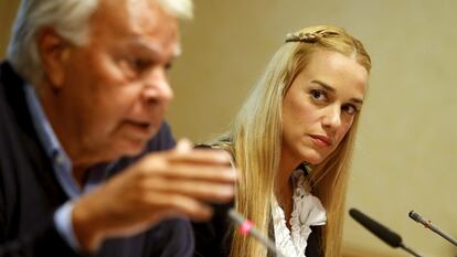 González, que se ha mostrado dispuesto a volver a Venezuela, ha asegurado también que el estado de excepción decretado por el Gobierno de Nicolás Maduro en 23 municipios por el conflicto fronterizo con Colombia tiene mucho que ver con el futuro de los próximos comicios del 6 de diciembre en ese país." El estado de excepción sigue extendiéndose. El objetivo es que no haya unas elecciones limpias", añadió. "Contra lo que sucedía con Hugo Chávez, con quien yo tuve grandes diferencias, a Maduro le da miedo la confontación electoral". A una pregunta de EL PAÍS, González ha confiado en que la reacción de los Gobiernos de América Latina a la condena del opositor venezolano "irá avanzando", pese a la tibieza de los primeros días. Tintori, que ha comenzado el acto declarándose "conmovida por el apoyo recibido de España y la comunidad internacional", ha desgranado las duras condiciones del encarcelamiento de López, completamente aislado en una "celda de dos metros por dos metros" y ha mostrado su preocupación por la integridad física del preso, que teme ser envenenado. "Seguiremos adelante", ha dicho.