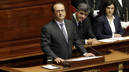 En su discurso ante el congreso extraordinario —la Asamblea Nacional y el Senado—, celebrado con toda la solemnidad imperial en el palacio de Versalles, Hollande ha desgranado las medidas que van a reforzar la capacidad de defensa y protección interior de Francia. El cambio constitucional que propone tenderá a adaptar la Carta Magna a la realidad. Para Hollande no tiene sentido que en un estado de emergencia se traslade la autoridad al Ejército y que solo se contemple una guerra exterior contra el país. “Estamos en una nueva era”, ha dicho.