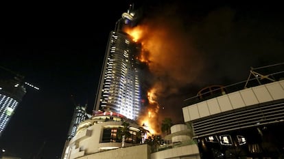 Un enorme incendio ha devorado gran parte de un rascacielos en Dubái, muy próximo al edificio más alto del mundo, el Burj Khalifa. Las llamas comenzaron durante un espectáculo de fuegos artificiales para despedir el año. Hacia las 22.45, hora local (tres horas menos en la España peninsular), el fuego quedó controlado. Las autoridades que investigan el suceso han explicado que comenzó en la parte exterior del vigésimo piso y que los extintores situados en el lugar evitaron que se propagara por el interior del edificio.