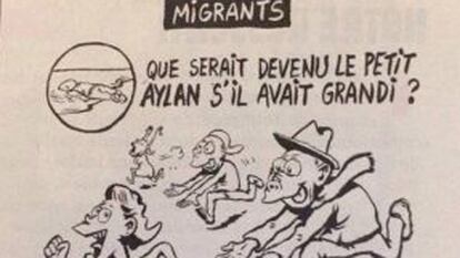 Laurent Sourisseau Riss, caricaturista y director de la publicación, aprovecha la reciente alarma por los abusos sexuales y robos masivos registrados la pasada Nochevieja en Alemania, entre cuyos presuntos autores hay peticionarios de asilo, para imaginar el hipotético futuro del niño sirio en caso de que su viaje a Europa se hubiera cerrado con éxito.