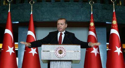 Entre las virtudes de Recep Tayyip Erdogan no se cuenta desde luego el talante. El jefe de Estado turco, quien verdaderamente gobierna el país pese a que su cargo es oficialmente poco más que ceremonial, no deja de repartir invectivas a diestro y siniestro: los académicos críticos son “traidores” y “quintacolumnistas”; quienes protestan en las calles, “saqueadores” y “ateos”; los políticos de la izquierda prokurda, “cómplices de los terroristas”; los socialdemócratas “aliados de golpistas”. Desde Noam Chomsky a Vladimir Putin, Erdogan se ha enfrentado en los últimos meses con todo aquel que le criticase, haciendo honor a la máxima de quien no está conmigo, está contra mí. No importa si son grandes o chicos, un gran medio de comunicación o un niño que arranca un póster con la efigie del presidente, la maquinaria judicial se pone en marcha para perseguirlos. “Intentar reprimir al que está en tu contra, en lugar de convencerle con palabras, es un signo claro de debilidad y desesperación”, arguye Gareth Jenkins, analista del Institute for Security and Development Policy, en entrevista con EL PAÍS.