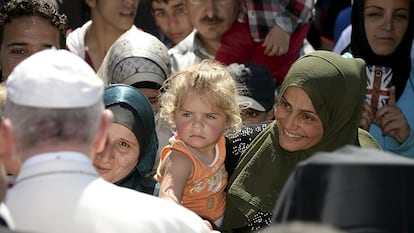 Una mujer que tenía una vida y una profesión y ahora tiene que mendigar ante el jefe de una religión que no es la suya unos cuantos euros para poder tratar el cáncer de hueso de su hija. Una niña que le entrega un dibujo al Papa en el que los cadáveres de otros niños cabalgan sobre olas de sangre. “Este niño ha pintado un sol llorando, y si el sol puede llorar, no estaría mal que también nosotros pudiéramos derramar alguna lágrima”, dice Bergoglio ya en el avión de regreso, donde vuelve a arremeter contra los traficantes de armas. “A esos traficantes”, dice el Papa mientras se le avinagra el gesto, “que en la guerra de Siria abastecen a unos grupos y otros, los invitaría a pasar una jornada en ese campo. Creo que para ellos sería bueno”. El antiguo arzobispo de Buenos Aires utiliza la palabra invitar, pero no parece esa la idea que refleja su cara. Solo unas horas antes había llamado “verdugos infames” a los traficantes de hombres, y entonces sí su rostro y sus palabras parecían de acuerdo.