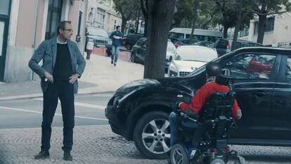 En su parabrisas descubre un papelito pegado que dice: “Golpeé su coche, teléfono 91389355”. El conductor, con cara de cabreo, revisa la impecable carrocería de su automóvil, aparcado sobre la acera. No aprecia desperfecto alguno, aún así llama al teléfono que le han dejado. “Tengo un aviso de que ha golpeado mi coche. ¿Es usted?” “Sí, sí, fui yo, ahora bajo”, le responden. El conductor resopla, como diciendo ‘hay que tener cara’, se impacienta con la espera, incluso empieza a dudar, pero finalmente aparece. Al verle, la cara del conductor pasa de la indignación a la vergüenza. Tiene delante a Salvador Mendes de Almeida, tetrapléjico, que ha llegado hasta allí en su silla de ruedas tras sortear los obstáculos cotidianos que le pone su ciudad, Lisboa, y sus conductores, que acostumbran a aparcar sobre las aceras con total impunidad. La escena forma parte de un vídeo grabado en una calle de Lisboa con el que se pretende inculcar civismo a los conductores.