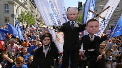 “La democracia está en riesgo, estamos ante un Gobierno controlador que se cree en posesión de la verdad y que quiere imponer su moral”, critica Sebastian Now, contable de 42 años, con su bebé de diez meses, Olga, en un brazo y una bandera de la UE en el otro. Desde que llegó al poder, el pasado octubre, el Gobierno nacionalista y euroescéptico de Ley y Justicia (PiS, en sus siglas en polaco), presidido por Beata Szydlo pero dirigido políticamente por Jaroslaw Kaczynski —el líder del partido—, ha emprendido una serie de reformas para ampliar la vigilancia en Internet, controlar los medios de comunicación para limpiarlos de periodistas críticos, recortar los derechos civiles y bloquear el Tribunal Constitucional; medidas que le han costado un toque de atención de las instituciones comunitarias. “Esto me recuerda demasiado a la época comunista. Si siguen así van a colocar a Polonia en los márgenes de Europa”, añade preocupado Now.
