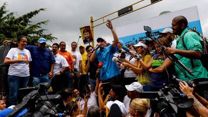 Henrique Capriles, excandidato presidencial y principal líder opositor en Venezuela, suele repetir desde hace meses que el país es una bomba a punto de explotar. Todo el mundo está pendiente de cuándo será el momento del estallido. Mientras llega, la tensión, pero sobre todo la incertidumbre por el devenir del país, aumenta con el paso de los días. Este miércoles es otra prueba de ello. "Voy a darlo todo, hasta la última gota de mi sangre para que mis hijas y mis nietos tenga un país mejor. Salgan a la calle, tenemos que luchar sin miedo", aseguraba Margot Nieto, una de las participantes.