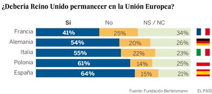 El estudio —basado en casi 11.000 encuestas realizadas en Alemania, Francia, Italia, España, Polonia y, para algunas respuestas, en Reino Unido— revela grandes dudas sobre las consecuencias que un Brexit tendría para el proyecto comunitario. Uno de cada cuatro encuestados no sabe si es mejor que la segunda economía europea se quede en el club comunitario o no. “Tenemos que admitir que hay un cierto nivel de desconocimiento. No es difícil de entender. La posición estratégica de los británicos ha consistido en que no se discutiera el asunto en el exterior para que no fuera percibido como intromisión”, argumenta Isabell Hoffmann, investigadora y responsable del trabajo de Bertelsmann.