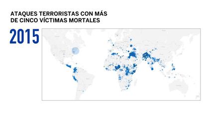 En el gráfico interactivo se muestran los atentados terroristas ocurridos entre 1970 y 2015 que causaron al menos cinco muertos (no se muestran aquellos para los que no se incorporan coordenadas geográficas, cerca de 800). En la parte superior se puede elegir el año que se desea consultar. Se muestran los atentados según su ubicación, y el número de víctimas determina el tamaño de los círculos.