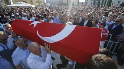 “Si ellos tienen tanques, nosotros tenemos fe”, tronaba este domingo en la monumental mezquita de Fatih de Estambul, escenario de funerales de Estado, con voz de tribuno el presidente de la República. Turquía despedía a las víctimas de la mayor intentona golpista registrada en 35 años, que se ha cobrado unos 290 muertos, más de un tercio de los cuales eran militares alzados en armas para derriban un Gobierno elegido en las urnas. Banderas turcas cubrían los féretros y ondeaban en los vehículos de los apesadumbrados cortejos que recorrían la ciudad.