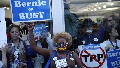 Para estos activistas, “votar por Hillary es un voto para Trump”, como rezaba una de las pancartas agitadas durante la revuelta, que se prolongó más de una hora. Ambos “son totalmente inaceptables para el futuro del país”, según Sánchez y sus compañeros de protesta. Así que la revolución que el senador por Vermont proclamó durante su campaña, continuará con o sin él. O a su pesar. “La realidad es que no es algo que él empezara, es algo que ya estaba allí y él fue el catalizador que supo unirnos, fue nuestro portavoz, pero no nuestro líder”, se apresuró a puntualizar Sánchez, que dijo no perdonarle a Clinton su apoyo a la guerra de Irak “y que ayudó al gobierno de Bush a vender esa guerra”. Las encuestas insisten en que la gran mayoría de seguidores de Sanders acabarán votando en noviembre a Clinton para evitar el mal mayor que a su juicio supone Donald Trump. Pero siempre quedarán grupos de descontentos como el que este martes volvió a ensombrecer la imagen de unidad tan ansiada por el Partido Demócrata.