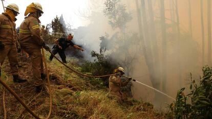 Los graves incendios que recorren Portugal en los últimos días han obligado al país a solicitar la activación del Mecanismo de Protección Civil —un programa europeo de respuesta inmediata a catástrofes—, según confirmó la ministra portuguesa de Interior, Constança Urbano de Sousa. "Estamos bajo condiciones meteorológicas extraordinarias que no son previsibles, ni posibles de dominar por el ser humano", dijo la ministra. Los fuegos han causado hasta este jueves cuatro muertos. Una madre y su hija, así como una persona ciega cuya relación con ellas aún no está clara, fallecieron en sus casas en la isla de Madeira y un guarda forestal lo hizo en territorio continental —en la región de Santarém—, en uno de los 13 grandes incendios que, este jueves por la mañana, se mantienen activos.