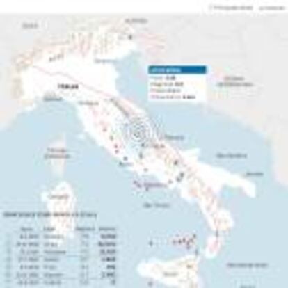 Gráfico del seísmo que calcula epicentro y movimientos de réplica y estadísticas de los principales terremotos de la historia de la península itálica