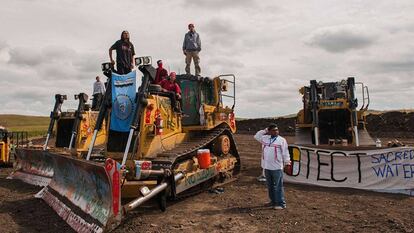 Miembros de la tribu Standing Rock apostados en excavadoras repletas de pintadas. Es el mayor símbolo de la pugna entre los sioux de Dakota del Norte y la empresa que construye un oleoducto que cruza el norte de Estados Unidos. El pulso ejemplifica el creciente debate ambientalista ante el boom energético que vive el país gracias a la proliferación de la técnica del fracking, de fracturación hidráulica del subsuelo.