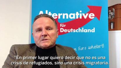 Pantalón vaquero, jersey negro de cuello vuelto y americana de franela marrón. Ojos claros y gran sonrisa. Georg Pazderski, el líder en Berlín del partido Alternative für Deutchland (Alternativa para Alemania), recibe a EL PAÍS en la sede de la formación política paradójicamente situada a pocos metros de la de la CDU de la canciller Angela Merkel, a la que le está comiendo terreno en el espectro político, para analizar la situación migratoria en Alemania. A brocha gorda: hay que cerrar las fronteras a cal y canto y priorizar la devolución de los migrantes a sus países de origen, incluido los menores no acompañados.