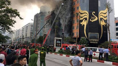 El fuego se inició en torno a las 14.00 del martes en un karaoke de la calle Tran Thai Tong de la capital, en una popular zona de entretenimiento de la capital, y los bomberos no dieron por extinguidas las llamas hasta siete horas después. Cuatro de las ocho plantas del edificio, en el que también hay apartamentos, quedaron calcinadas.