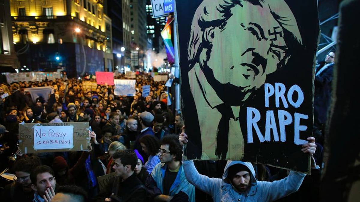 La fina lluvia que durante la tarde bañó la isla de Manhattan no impidió que varios centenares de neoyorquinos, como la profesora Julia Dunn, se echaran a la calle en varios puntos de la ciudad de los rascacielos para expresar su frustración con la elección de Donald Trump como presidente de los Estados Unidos. Cuenta que llevaba varios días nerviosa y que esperaba que ese estrés se hubiera aliviado viendo a Hillary Clinton romper el techo de cristal. La imagen se replicó en una decena de ciudades del país, donde el descontento, el miedo y la ansiedad cobró la forma de un gran grito de liberación por las calles.