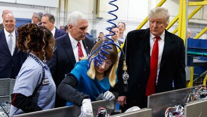 La visita a la planta de Carrier, en Indianapolis, tenía mayor calado. Se trataba de un gesto que le permite proyectar la imagen de presidente que cumple sus promesas. Carrier se convirtió durante la campaña en un símbolo. Había anunciado el traslado de 2.300 empleos a México y Trump lo aprovechó como ejemplo de los males de los tratados de libre comercio. Una de sus promesas era que, si ganaba las elecciones, forzaría a United Technologies, empresa matriz de Carrier, a mantener los empleos en Indianapolis.