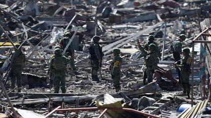 Nueve velas colocadas en forma de cruz recordaban este miércoles a las víctimas, que ya suman 35 muertos, 54 heridos y al menos 17 personas sin localizar. Al fondo de la plaza, un grupo de voluntarios recogen comida para las familias afectadas. Roberto García, 62 años, acaba de dejar una bolsa de arroz y otra de frijoles. Apunta con el dedo a las velas y explica que justo ahí, cada 8 de marzo por San Juan de Dios, patrón de los coheteros, salen los toritos: “son unos carros de vara y aluminio con ruedas. Los hacen bien altos, como de cuatro metros. Los llenan de cohetes y de luces y los echan a correr por la plaza. Se arma un buen relajo”.