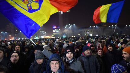 Rumanía ha dado un paso en dirección contraria a la que ha sido una de sus batallas en los últimos años: la lucha contra la corrupción. Este martes por la noche, y por sorpresa, el Gobierno del Partido Socialdemócrata (PSD) ha aprobado una nueva ley que despenaliza algunos delitos de abuso de poder y de corrupción si han provocado un perjuicios no superiores a 200.000 lei (44.000 euros). Miles de personas salieron a la calle a medianoche y este miércoles para protestar por la medida, sancionada por un decreto de urgencia de forma que no debe pasar por el Parlamento. Mientras, la Comisión Europea ha mostrado su preocupación y ha alertado del retroceso que supone la norma.
