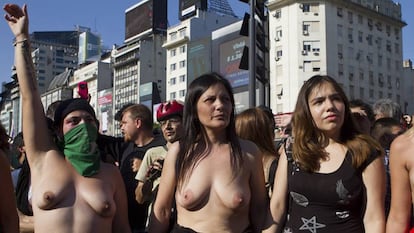 Si alguien tenía dudas de la fuerza del machismo en Argentina solo tenía que acercarse este martes al Obelisco, en el corazón de Buenos Aires. Unas decenas de mujeres mostraban sus tetas para exigir que se legalice el topless. A su alrededor, dos centenares de hombres se subían a los jardines para poder verles los pechos, algo tabú en Argentina, mientras ellas gritaban "afuera los machos". Tres adolescentes treparon al mástil de una bandera para poder ver mejor las tetas. Los mirones eran cada vez más numerosos, y algunos hacían fotos. La mayoría de las manifestantes eran jóvenes; los que las miraban, mucho mayores. La tensión fue subiendo y acabó a golpes. Primero entre las mujeres y un hombre que las fotografiaba, y después entre varios hombres que apoyaban la causa del topless y acabaron apaleando al mirón. Todo sucedía en 2017 en uno de los países históricamente más avanzados de Latinoamérica, y en una de las ciudades con mayor actividad cultural del planeta.