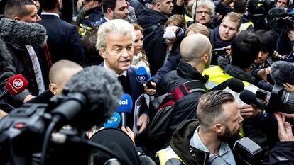 Geert Wilders, el líder antimusulmán holandés, ha inaugurado la campaña electoral de su Partido para la Libertad (PVV, en sus siglas en neerlandés) con una visita a la localidad de Spijkenisse, cercana a Rotterdam. Las fuertes medidas de seguridad y la abundancia de agentes de policía de uniforme y de paisano han relegado a los residentes del municipio de poco más de 70.000 habitantes. Consciente de la repercusión mediática de su presencia, Wilders ha resumido su programa en sendos mensajes: “Será una votación histórica porque los holandeses podremos recuperar nuestro país”; “hay demasiada chusma marroquí en nuestra tierra”. El político xenófobo —que en diciembre de 2016 fue condenado (aunque no sancionado) por insultos y discriminación hacia los marroquíes— encabeza en estos momentos las encuestas para los comicios del próximo 15 de marzo. El resultado será el primero en mostrar el verdadero tirón del populismo de extrema derecha europeo, ya que después votará Alemania y Francia, ambos con la extrema derecha en auge.
