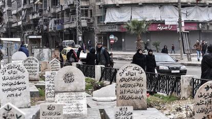 El camino entre Damasco y Alepo se completa en cuatro horas por carretera. Los 360 kilómetros que separan a las dos ciudades están atestados de controles militares y zonas de combate como Homs, Hama y Khanaser, escenario de violentos combates entre insurrectos y Ejército regular junto a las milicias aliadas. Una enviada especial de EL PAÍS recorre Siria poco antes de que se cumplan los seis años de guerra, pero en vez de hacerlo por la histórica M5, debe desviarse por lo que tarda el doble.