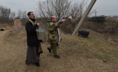 “No financiamos terroristas ni el comercio con los ocupantes y no negociamos sobre la sangre”, reza un letrero a la entrada del campamento, al que llegamos cuando dos sacerdotes castrenses se disponen a oficiar unas plegarias colectivas ante un pintoresco altar con las imágenes de Jesucristo y la Virgen María.