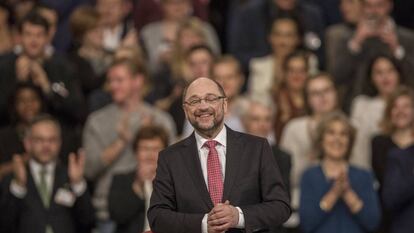 La martinmanía se apoderó el domingo de Berlín. Martin Schulz ha logrado lo que hace poco parecía imposible: devolver el optimismo a la socialdemocracia alemana. Su figura era omnipresente en cada uno de los rincones del recinto donde el exalcalde de una pequeña ciudad fue coronado como la gran esperanza de su partido para las elecciones de septiembre. En plena crisis del centro-izquierda europeo, cuyo último episodio experimentaron los holandeses hace solo cuatro días, Schulz se eleva y mira ya de tú a tú a la otrora invencible Angela Merkel. “Estamos de vuelta. Es una buena noticia para Alemania, para Europa y para la democracia”, dijo en un ambiente de euforia el recién ungido líder.