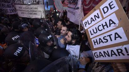 La conflictividad social en Argentina genera cada vez más tensión en las calles, ahora con la convocatoria de la Confederación General del Trabajo (CGT) a una huelga nacional, la primera que los sindicatos peronistas declaran al presidente Mauricio Macri. Buenos Aires, la capital, amaneció casi vacía y con sus ingresos más importantes amenazados por cortes de los movimientos sociales más combativos, que no acataron la decisión sindical de hacer un paro sin movilizaciones, piquetes ni manifestaciones. Pero poco a poco empezaron a entrar coches de personas que hicieron caso al Gobierno y fueron a trabajar por sus medios, ya que el transporte público estaba completamente paralizado. La huelga se convirtió rápidamente en un pulso entre el Ejecutivo y la oposición y demostró la propia división dentro del mundo sindical, donde algunos querían mucha más dureza y otros dudaron hasta el final antes de convocar este paro. El intento de algunos piquetes de cortar los accesos principales a la capital acabó con violentos enfrentamientos con la policía, que tenía la orden de impedir el bloqueo de las autopistas.