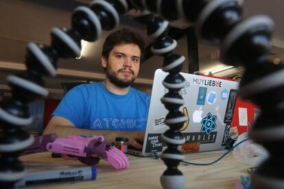 Gino repite números de autobuses como si se tratase de su propio código genético. El 42, el 118, el 70. Son las líneas en las que viajó durante horas –en ocasiones solo, en otras con su mamá- para formarse como inventor, un oficio muy difícil de desarrollar en Argentina, donde casi no existe un mercado de capitales que facilite la financiación de proyectos. “Nací en Pompeya y en mi barrio hay chicos que ni siquiera podían hacer la escuela tradicional, pero mi vieja se rompió el lomo para que yo pueda estudiar”, dice el joven a EL PAÍS en Atomic Lab, como llamó al taller que armó cerca de su casa y al que viaja cada día en patineta. Allí concreta el sueño de cientos de niños y niñas que hoy cuentan con una prótesis que les permite escribir, jugar, peinarse o tocar la trompeta. “No me gustó como quedaron las que imitaban el color de la piel, entonces decidimos hacerlas con los colores de los superhéroes y que cada chico elija su preferido”, cuenta.