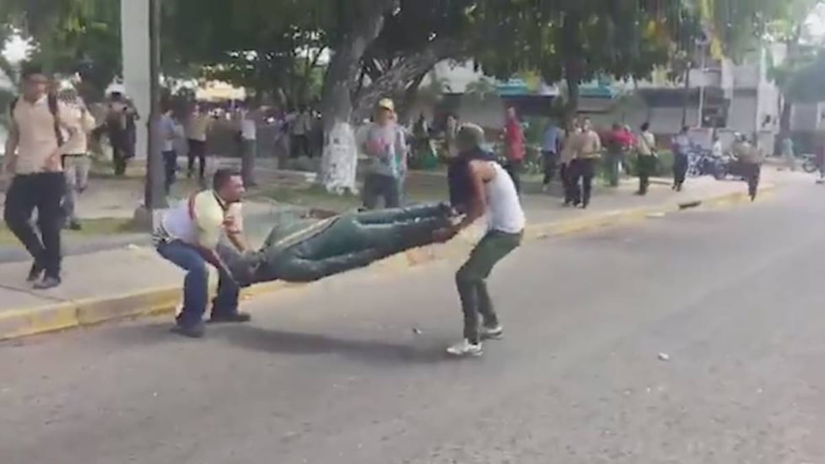 Un vídeo que muestra el momento en que una estatua del fallecido expresidente venezolano Hugo Chávez es destruida por manifestantes este viernes en Rosario de Perijá (noroeste, cerca de Maracaibo) en una protesta contra su sucesor, Nicolás Maduro, se ha hecho viral entre los internautas del país sudamericano.