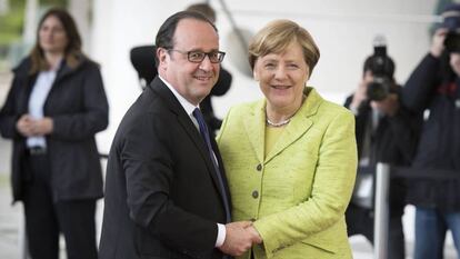 Minutos antes, su portavoz, Steffen Seibert, echaba otro jarro de agua fría en otra comparecencia ante la prensa: “El Gobierno alemán continúa rechazando los eurobonos”, dijo en alusión al mecanismo que permitiría emitir títulos de créditos para aliviar la crisis de la deuda en Europa. Merkel ya dijo en su día que la mutualización de deuda en Europa no llegará "mientras yo viva". Preguntados los portavoces del Gobierno sobre las ideas del nuevo presidente francés de que los países de la eurozona compartan más responsabilidades, no ha habido respuestas para los periodistas. Tampoco sobre un posible reforma del pacto de estabilidad.