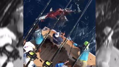 Las muestras de salvajismo no dan tregua en México. Esta vez el enfrentamiento ha sido entre un grupo de hombres y un animal, un tiburón tigre en Veracruz, al este del país. Desde una barca de al menos dos plantas de altura, siete hombres pescan a uno de estos ejemplares marinos para, después de tirar de él hacia la embarcación, dispararle: una, dos, tres y hasta cuatro balas destrozan al animal cuya sangre que brota a borbotones tiñe el agua del golfo de México. En este vídeo, la naturaleza deja claro una vez más que la especie más evolucionada conocida tiende al salvajismo tanto como el animal más básico.