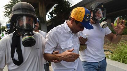La oposición intentó llegar de nuevo este lunes a la sede de la Defensoría del Pueblo, en el centro de Caracas, y una vez más las fuerzas represivas del régimen de Nicolás Maduro lo impidieron. En rigor, la protesta, denominada La marcha de los caídos, en memoria de las 59 víctimas que ha dejado la más reciente escalada de la crónica crisis política de Venezuela, siguió el mismo libreto de siempre: concentración en las zonas que controla la oposición, al este de la capital venezolana, y una caminata por la principal autopista abortada con bombas lacrimógenas. Pero esta vez entre los afectados está el excandidato presidencial Henrique Capriles, a quien la agresión de la Guardia Nacional Bolivariana le provocó un hematoma en la mejilla izquierda. A Capriles le pegaron con un casco de motorista y recibió un puñetazo.