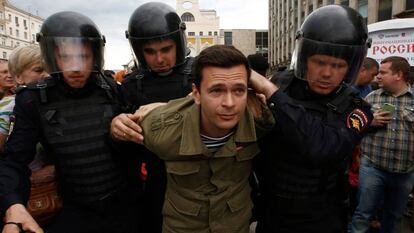Centenares de personas fueron detenidas en Rusia por participar en mítines contra la corrupción que, bajo el lema “exigimos respuesta”, habían sido convocados en Moscú, San Petersburgo y otras ciudades por el político de oposición Alexéi Navalni con ocasión de la fiesta nacional del lunes. El mitin de la capital se celebró, sin embargo, sin Navalni, que fue arrestado al salir de su domicilio y ha sido condenado a 30 días de cárcel, ha informado en Twitter su portavoz. Las protestas, en la línea de las que se celebraron el 26 de marzo, sacaron a la calle a varios miles de descontentos (4.500 en Moscú y 3.500 en San Petersburgo, según el Ministerio del Interior), en gran parte escolares.