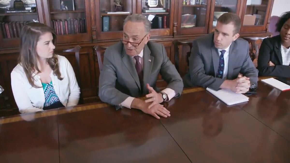 “Tu tono fue perfecto”, dijo uno. “El mensaje fue el correcto”. “Tienes el mejor pelo —nadie tiene un pelo mejor que el tuyo”, señaló el tercero de los asistentes de Schumer. El veterano senador tuiteó el cortometraje con un claro mensaje irónico hacia los mensajes en esa red social del propio presidente. “GRAN reunión hoy con el mejor equipo en la historia del mundo”, escribió.