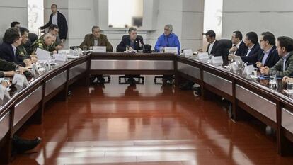 El Gobierno colombiano no permitirá que el atentado de este sábado en el centro comercial Andino de Bogotá influya en la agenda de paz iniciada en 2016 con la firma de los acuerdos entre el Estado y las FARC. El presidente, Juan Manuel Santos, ha reunido este domingo por la mañana al consejo de seguridad encargado del seguimiento del ataque que acabó con la vida de tres mujeres y dejó una decena de heridos cuando faltan tres días para que la guerrilla culmine la entrega de armas. Al término del encuentro, lanzó un mensaje de serenidad a la población y advirtió: “Hemos avanzado mucho para consolidar la tranquilidad de los colombianos y tengan la seguridad de que no vamos a permitir que lo logrado hasta ahora sea frenado por un puñado de extremistas, de cobardes o de quienes no quieren la reconciliación del pueblo colombiano”.
