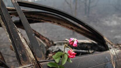 El sábado, el infierno en forma de bolas de fuego llegó aquí y aquí se quedó. El único rastro de vida es una rosa colgada de la puerta de un coche quemado. Dentro iban una abuela, la hija y su nieta. Pensaron que era mejor huir en el coche que quedarse en casa. Esa rosa es lo único que sobrevivió.