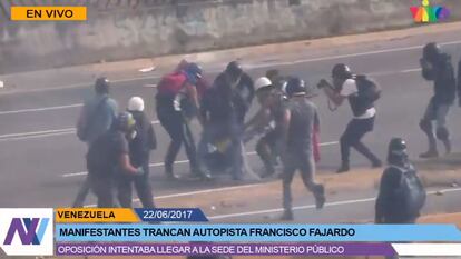 El asesinato de David José Vallenilla Luis, un estudiante de enfermería de 22 años de edad, ha sido transmitido en directo este jueves en Venezuela. En un vídeo de VivoPlay, un medio digital independiente, se muestra a militares detonar sus armas contra manifestantes opositores en la autopista Francisco Fajardo, la principal arteria que comunica al oeste con el este de Caracas. Vallenilla —rostro parcialmente cubierto por una franela negra y vestimenta color azul— cae en el asfalto tras ser herido de varios disparos de perdigón en el tórax.