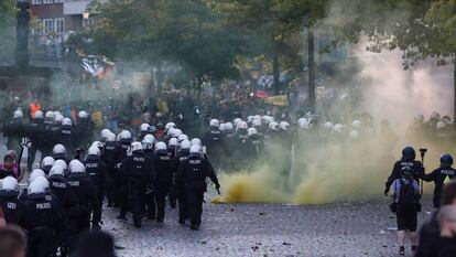 “Bienvenido al infierno”. Es es el lema de la marcha con la que los antisistemas recibieron este jueves al presidente estadounidense Donald Trump y al resto de mandatarios del G20, que reúne a los países más industrializados del planeta con los emergentes, que el jueves han ido llegando a Hamburgo. La marcha derivó en fuertes enfrentamientos con la policía en el centro de la ciudad natal de la canciller Angela Merkel, anfitriona de la cumbre, que el jueves amaneció fortificada, coronada con alambre de espino y repleta de barricadas.